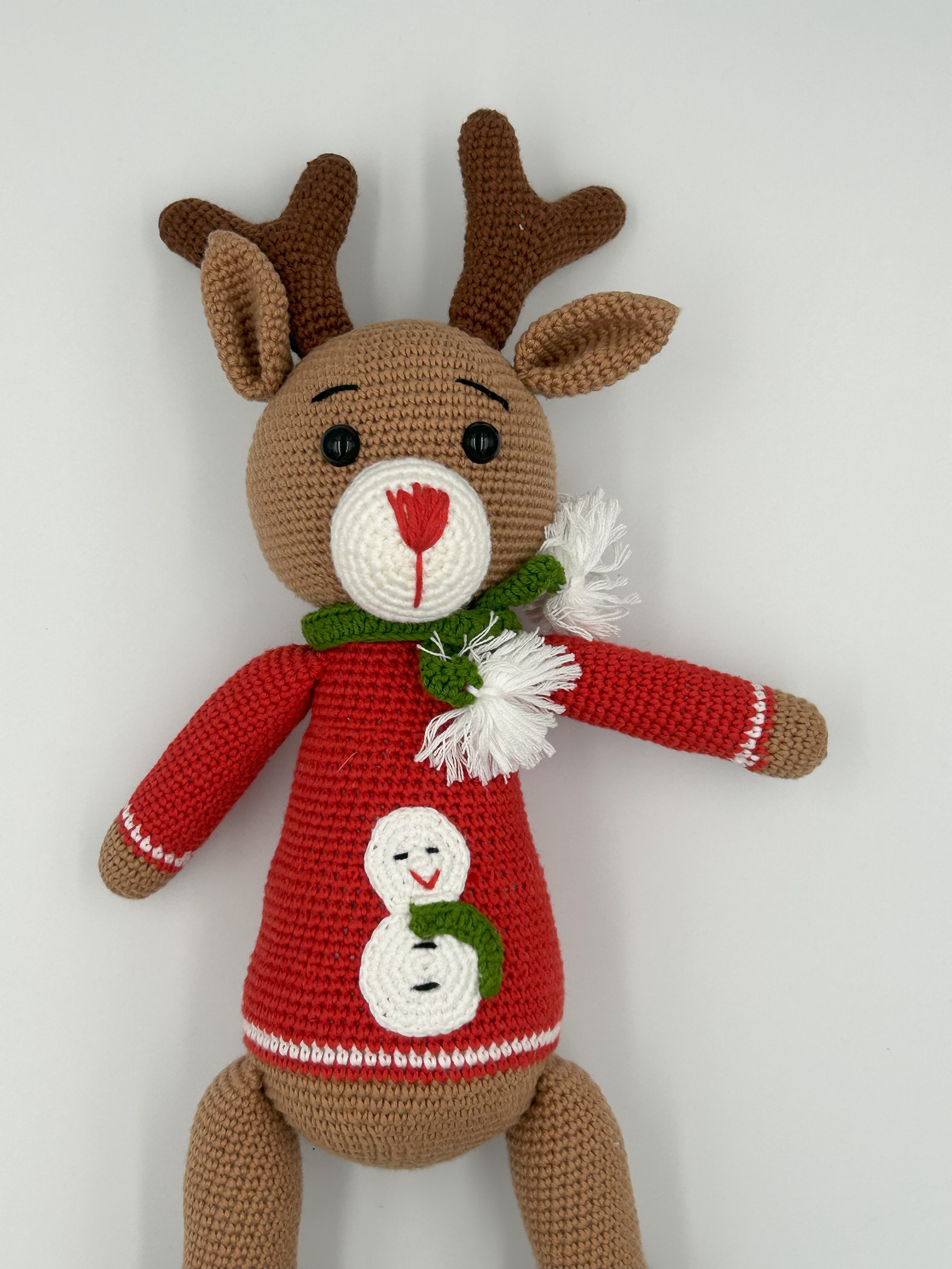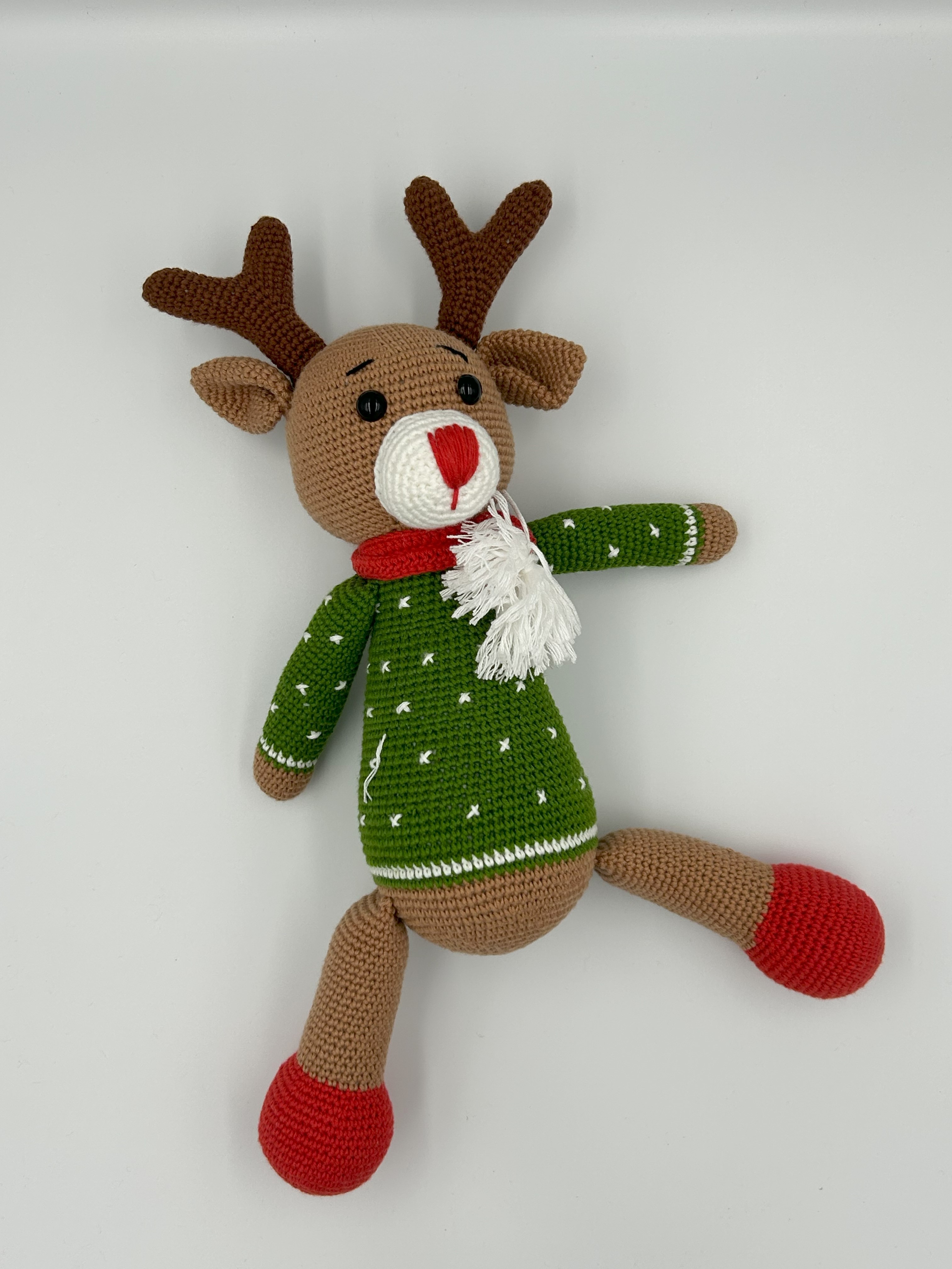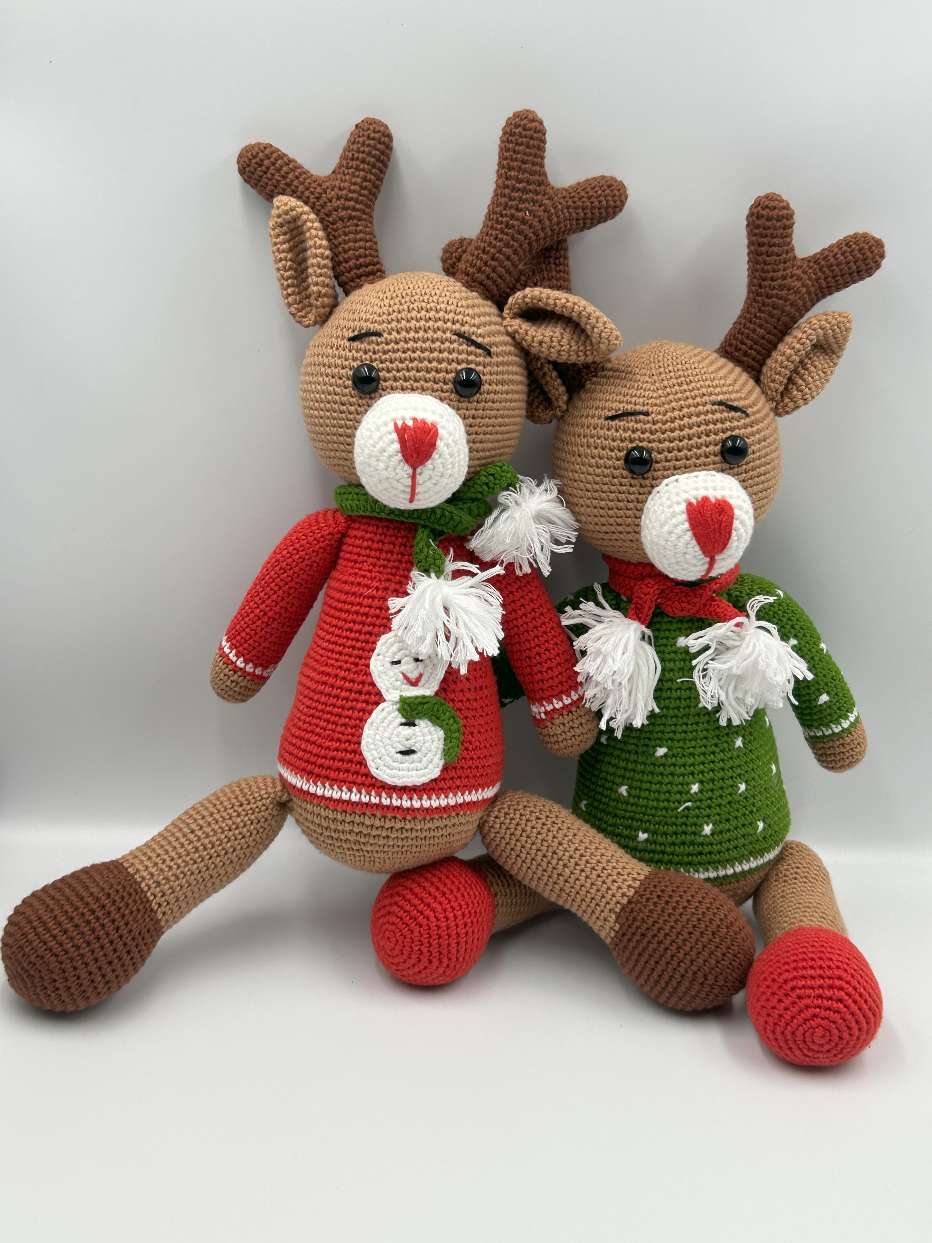 Celebrate the holiday spirit with our handcrafted Amigurumi Reindeer Crochet Toys, perfect for bringing joy and warmth to any Christmas setting. Standing at 32 cm in height and 13 cm in width, these charming reindeer are meticulously crocheted, showcasing exquisite craftsmanship and attention to detail.